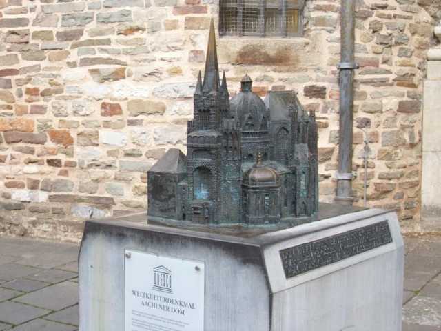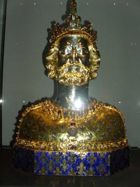 Aachener Doms zeigen lassen. Vor unserer gebuchten Dombesichtigung nutzten die meisten noch die Möglichkeit für einen Rundgang durch die Domschatzkammer. Einzigartige Exponate mit unermesslichem Wert aus spätantiker, karolingischer, ottonischer, staufischer und gotischer Zeit, die zum Teil zu den größten Kunstwerken ihrer Epoche gehören, sind dort ausgestellt; besonders fiel uns hier noch neben oben gezeigter Karlsbüste das erste Originalkonterfei Karls des Großen als Dinar-Münze des Jahres 813 und das goldene Evangeliar Kaiser Heinrichs (siehe auch u.a. Anhang) auf.